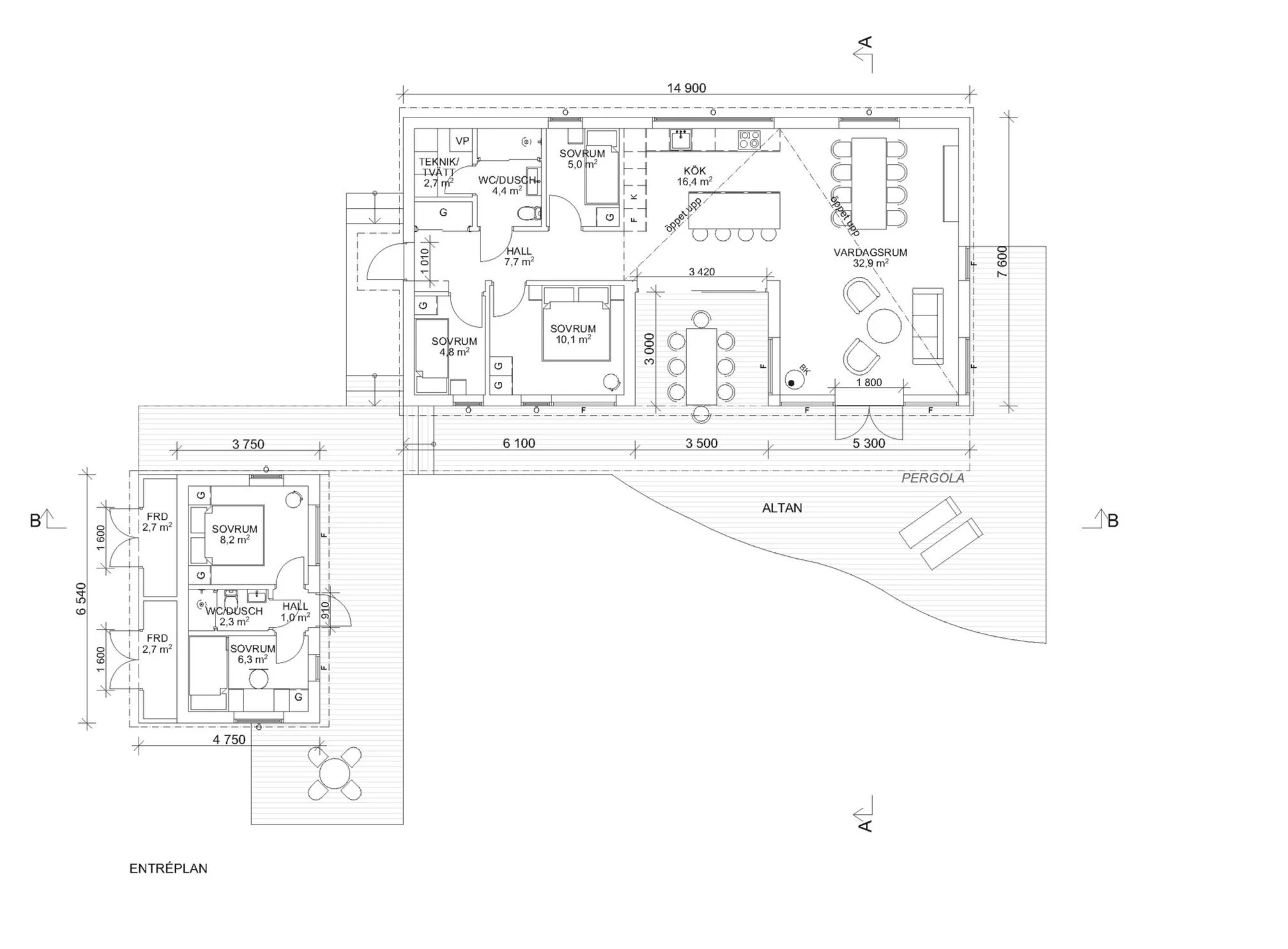 Generous glass openings face inward toward the garden, drawing nature into the heart of the home. The terraces follow the natural form of the buildings and connect the two volumes with a pergola structure for sun protection.