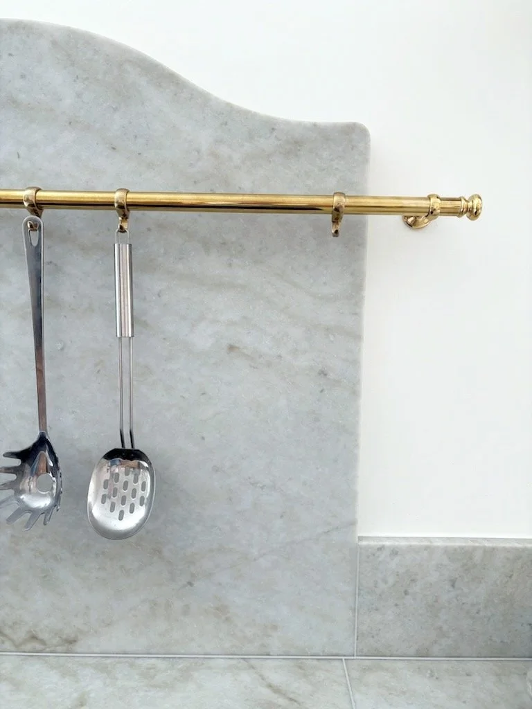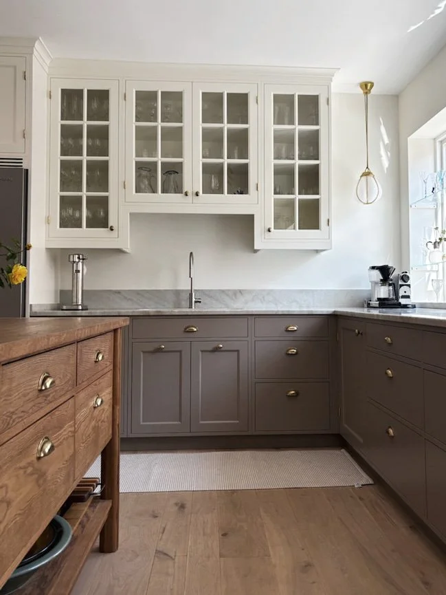 The palette ranges from soft whites to earthy nutmeg tones, with details in stainless steel, brass, and marble. At the center stands a large, custom-built kitchen island in solid oak — the room’s centerpiece and social hub. Deep countertops line the perimeter, offering generous storage in the form of drawers, while open shelving and a glass-front cabinet create a light, airy feel above. A large fridge-freezer and oven add a rustic touch. Blending modern function with the old-world charm of the house, this kitchen feels as much like a living room as a workspace — a cozy place to be, from early morning to late evening.