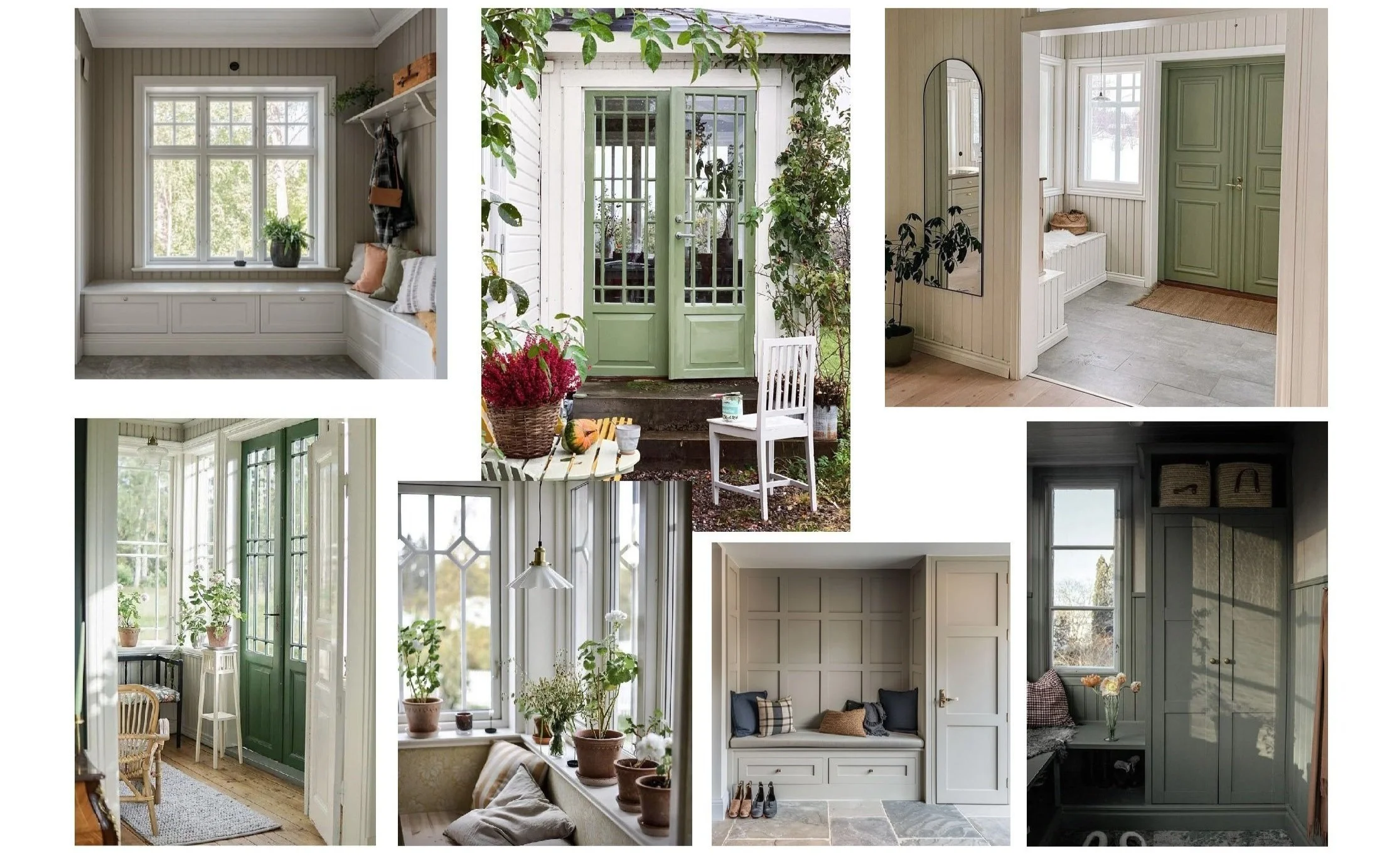 The space offers generous storage while also acting as a light-filled French-style veranda, with glazed double doors, large windows, and a small seating area where the afternoon sun gently filters in.